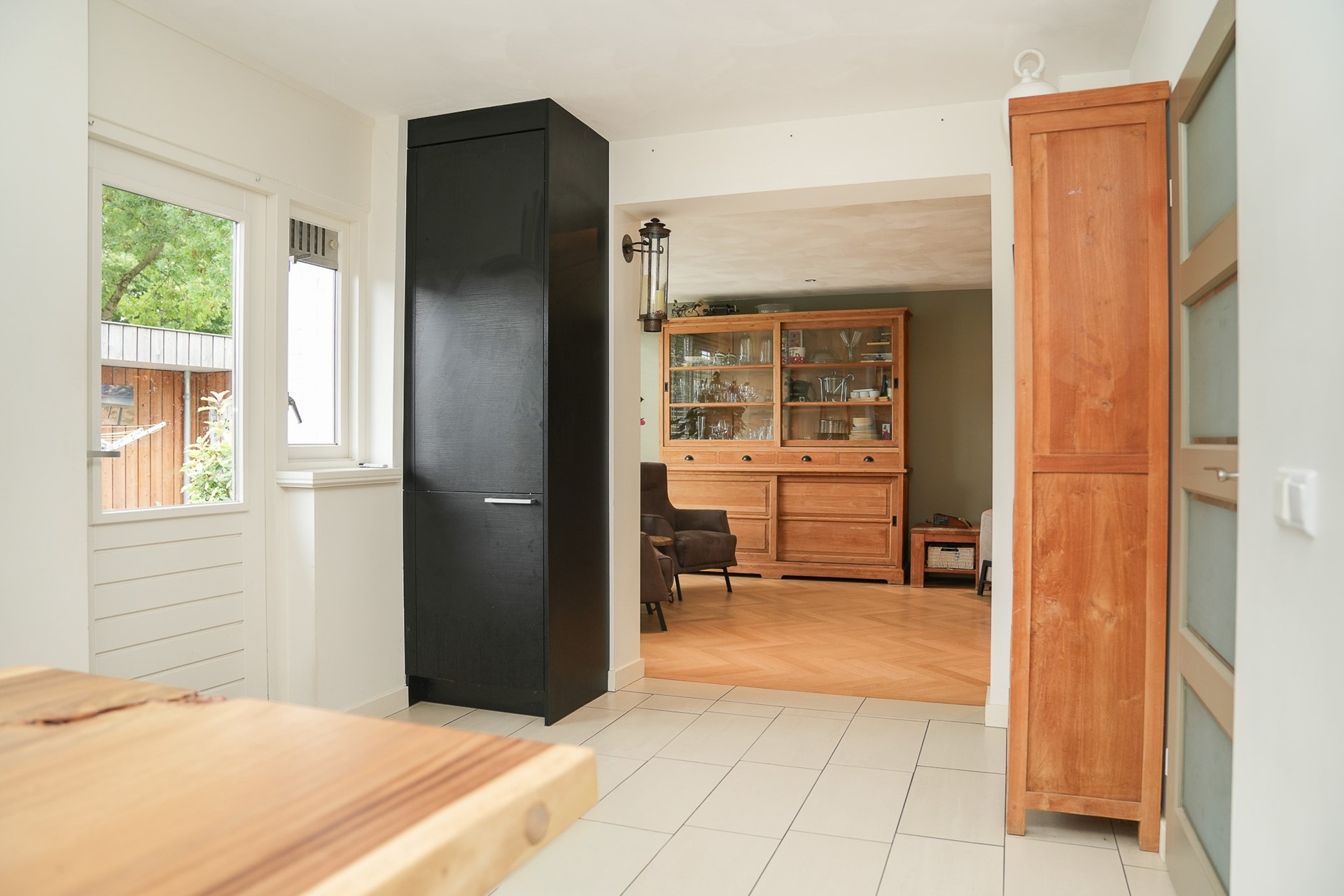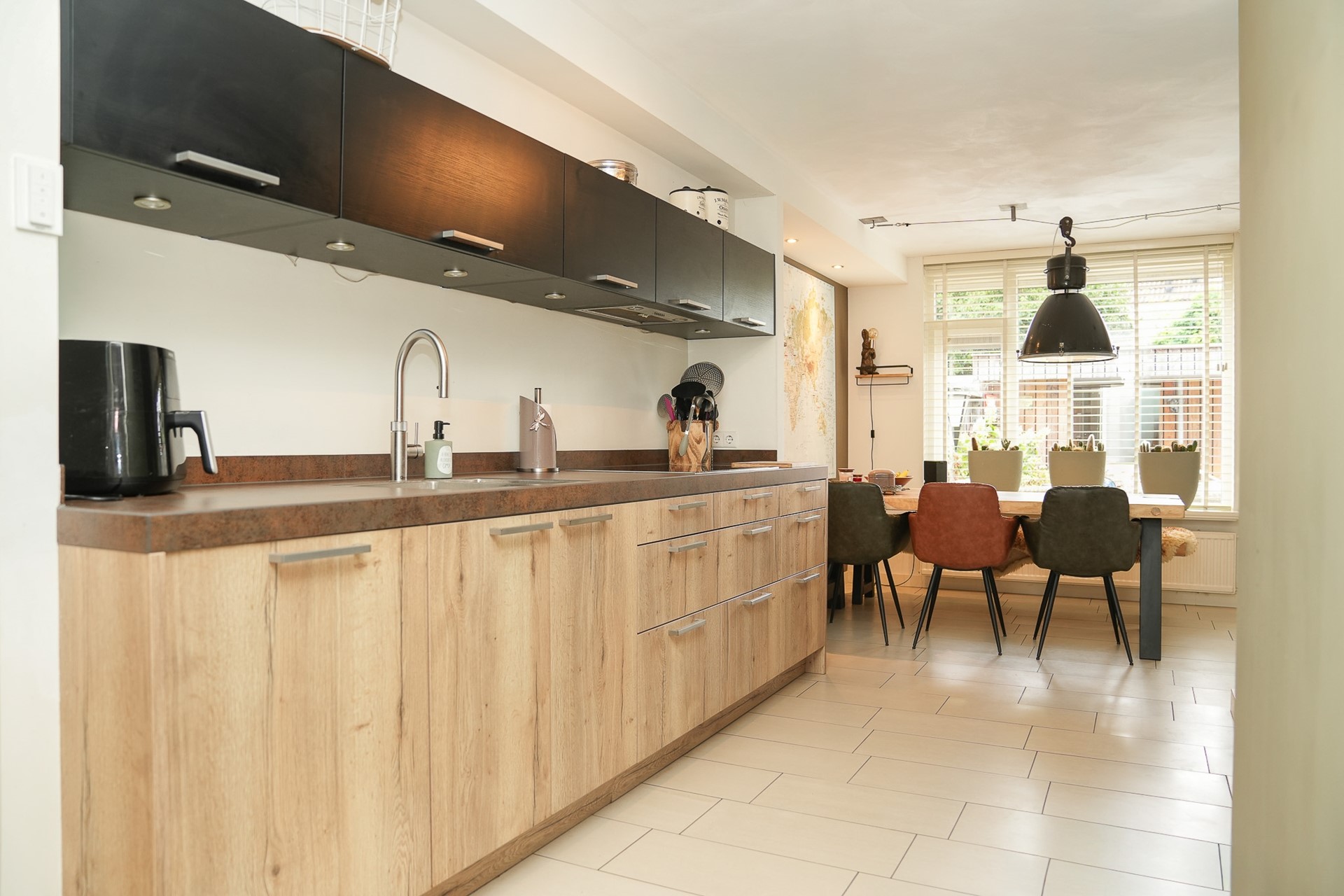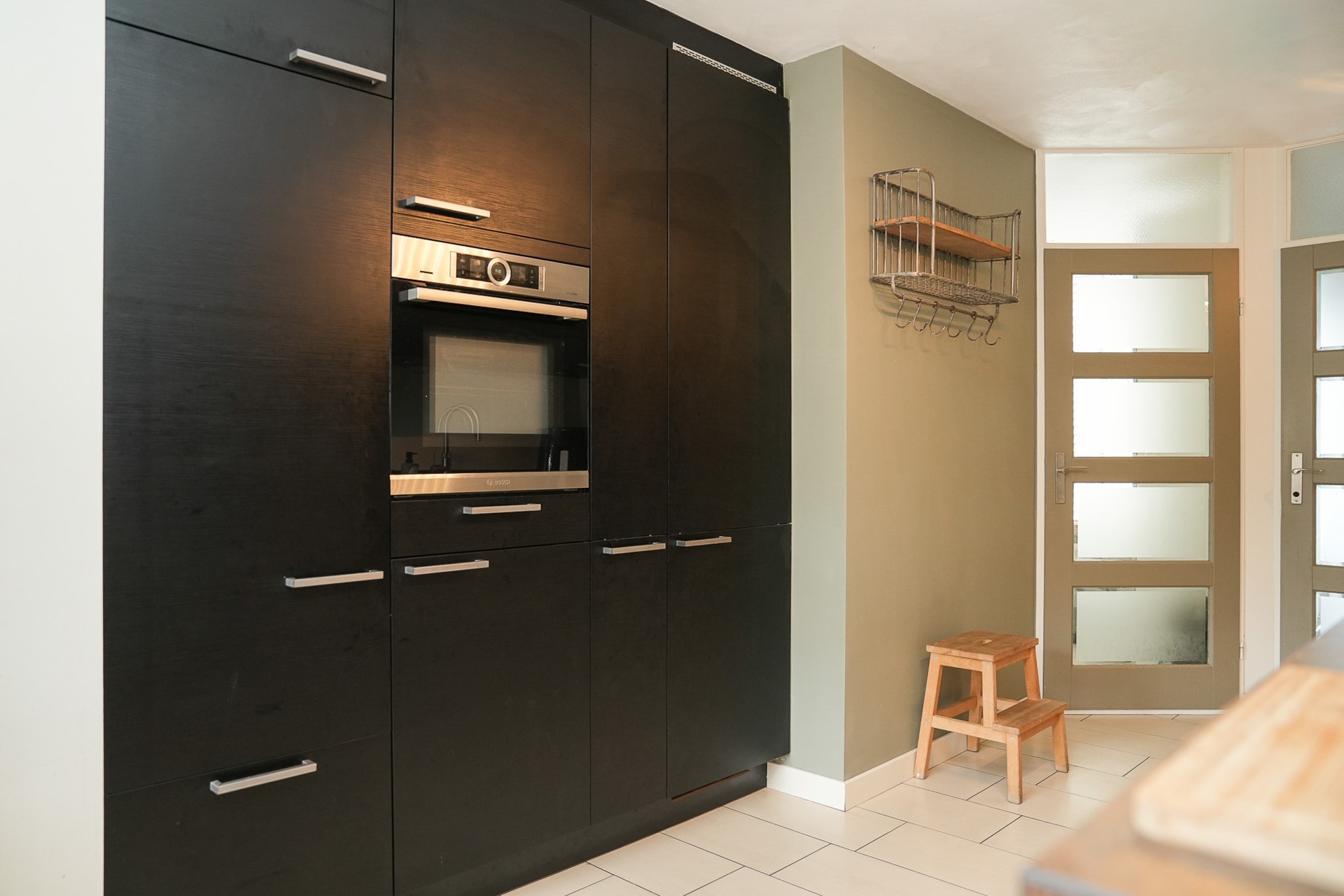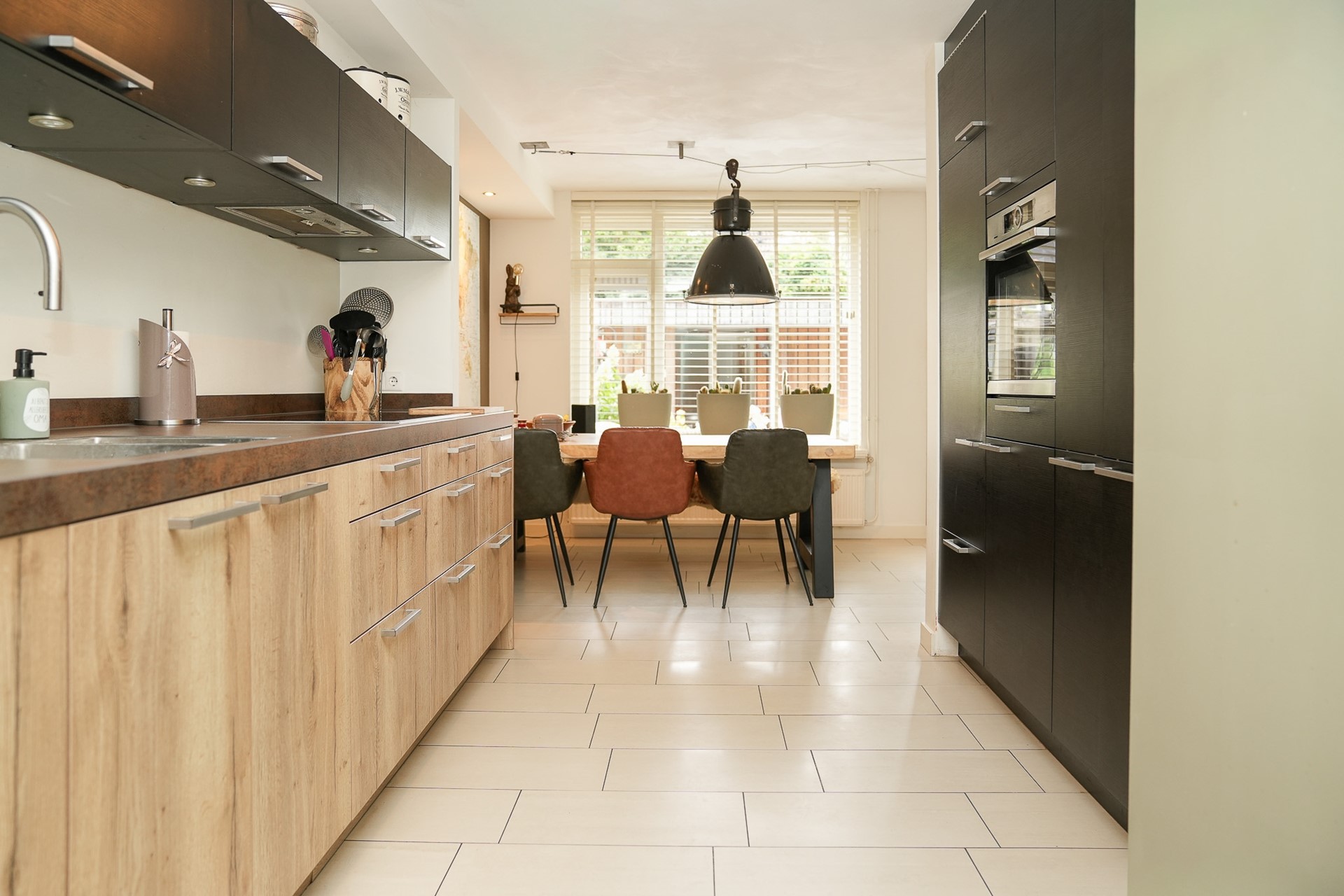 De moderne keuken in dubbele wandopstelling is een fijne plek om te koken en samen te komen. Voorzien van een keramiek werkblad, Quooker, apothekerskast, voldoende bergruimte en luxe inbouwapparatuur zoals o.a. een inductiekookplaat, afzuigkap, combimagnetron en vaatwasser. Via het eetgedeelte loop je zó de achtertuin in.