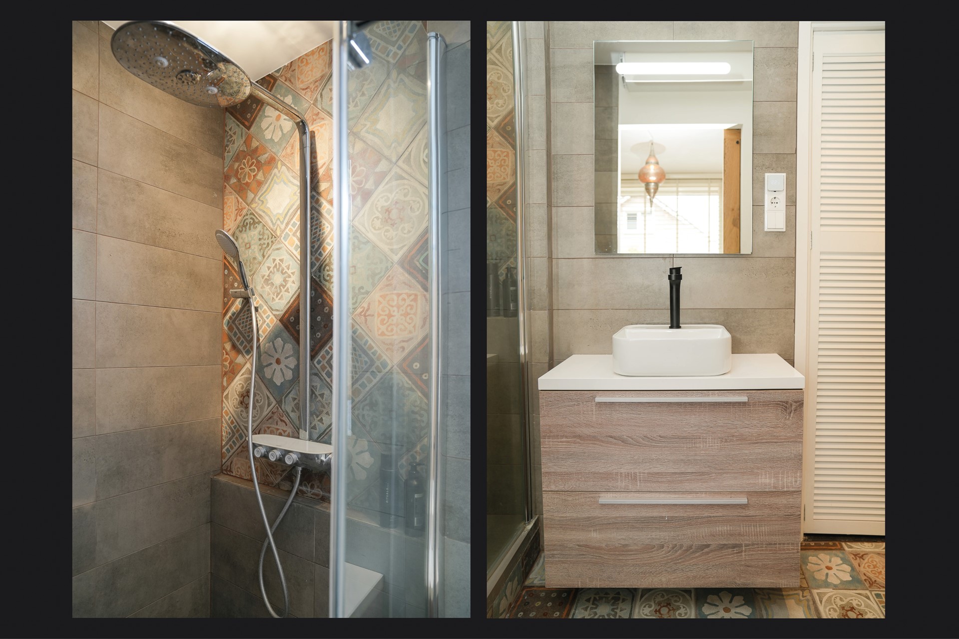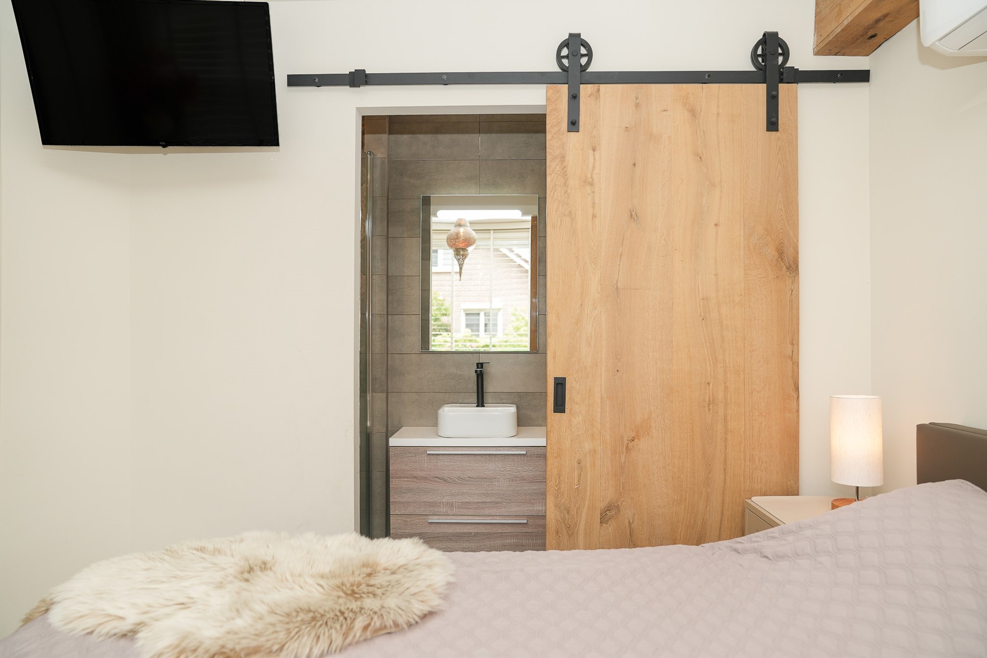 De woning is ideaal voor wie nu of in de toekomst gelijkvloers wil wonen. De slaapkamer op de begane grond is netjes afgewerkt met plavuizen, voorzien van airconditioning (2021) en biedt directe toegang tot de moderne badkamer met o.a. een stortdouche, wastafelmeubel met verlichte spiegel en elektrische vloerverwarming. In een aparte ruimte vind je hier ook de wasmachine- en drogeropstelling.