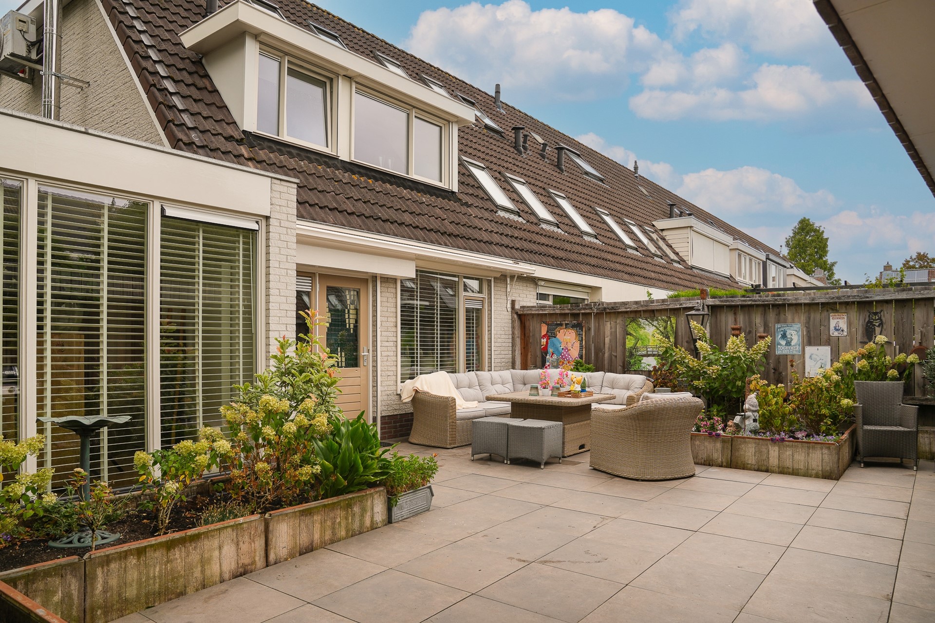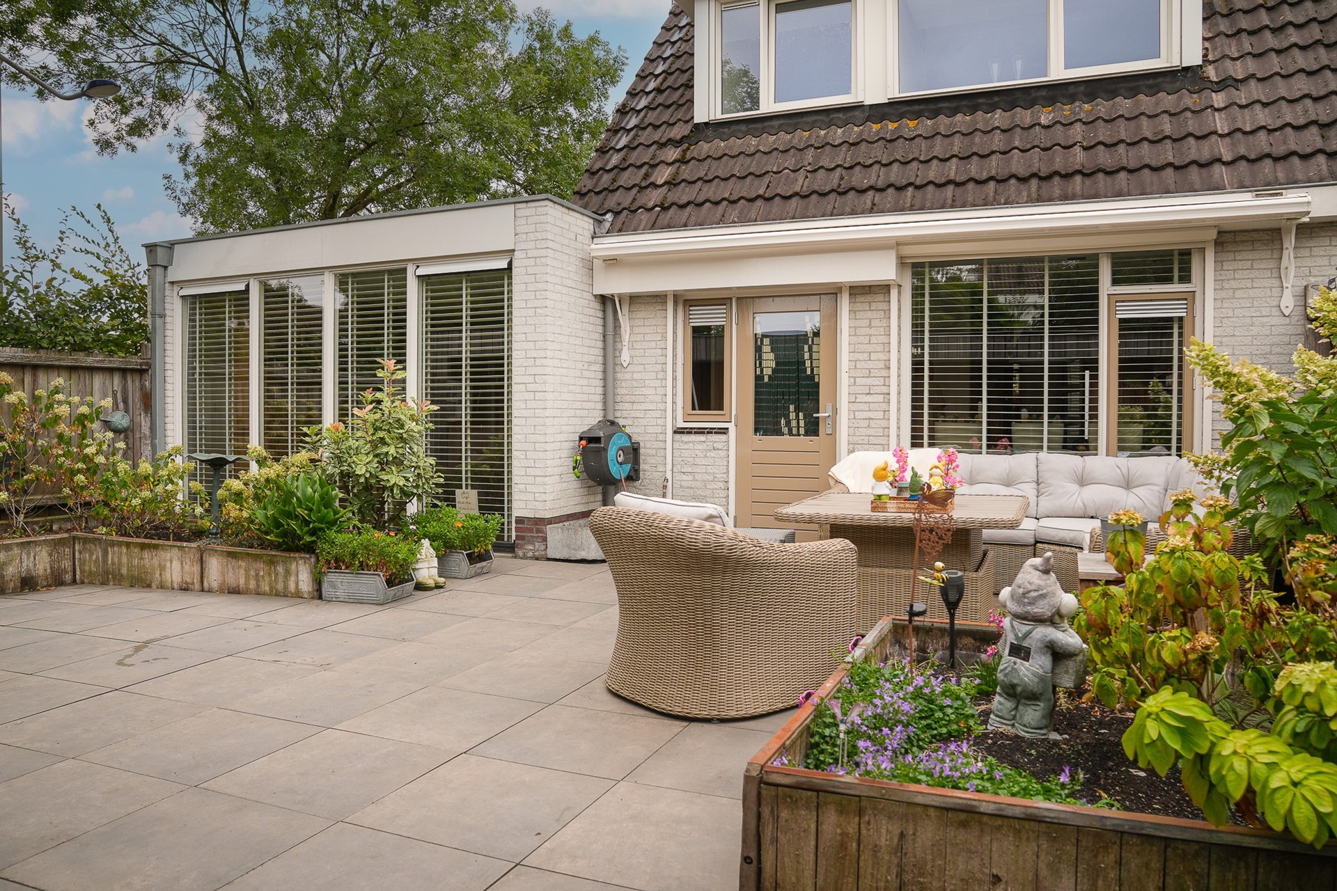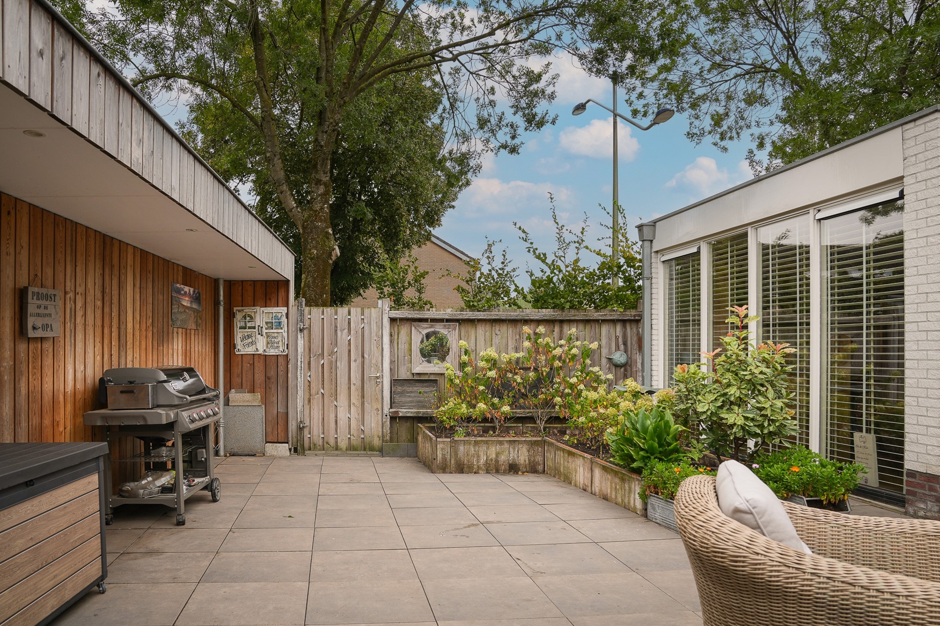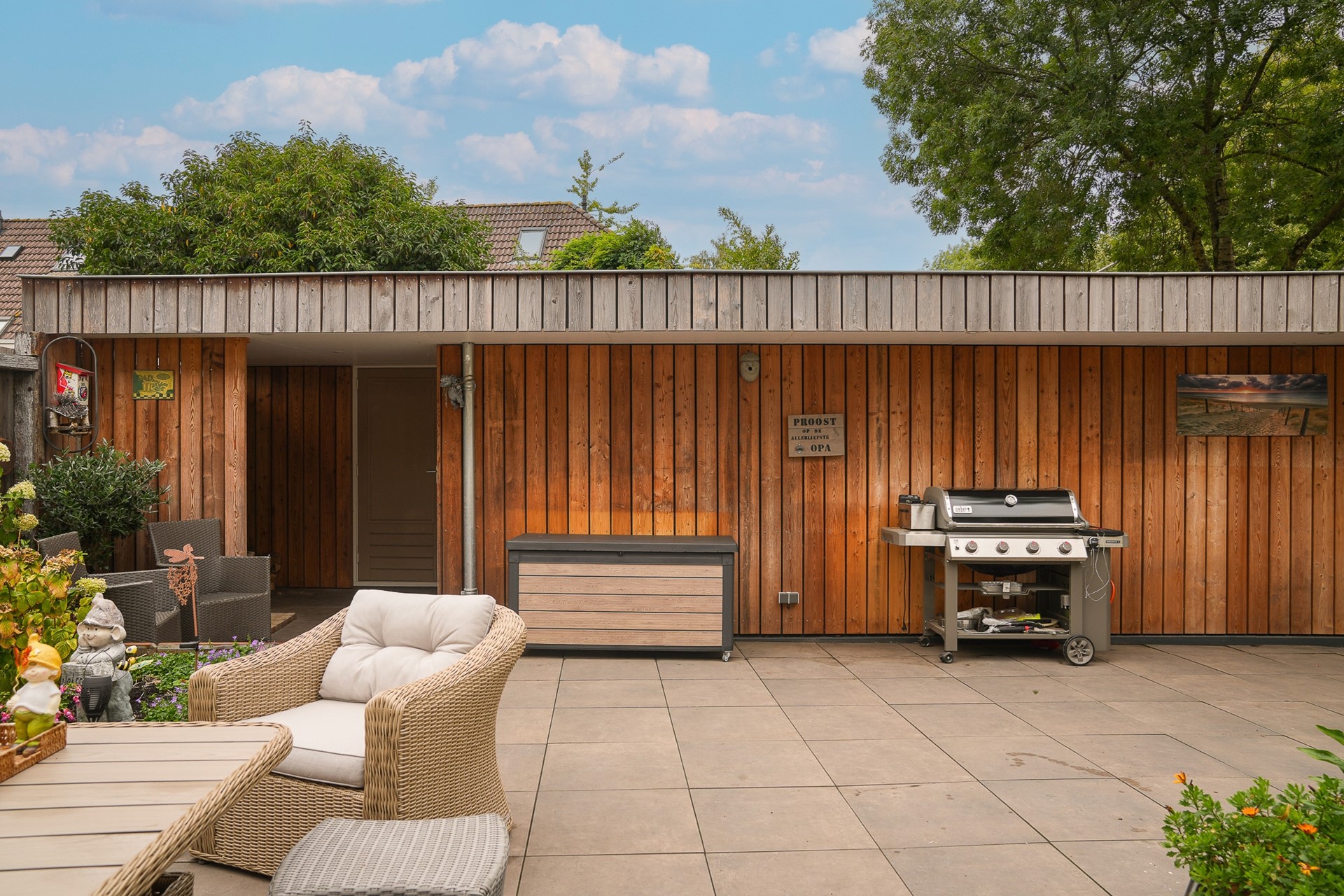 De fraai aangelegde achtertuin, gelegen op het noordoosten, is een heerlijke plek om te ontspannen. Met een gezellige overkapping, een elektrisch zonnescherm, mooie beplanting én een ruime geïsoleerde berging voorzien van verwarming, water en stroom ben je hier van alle gemakken voorzien.