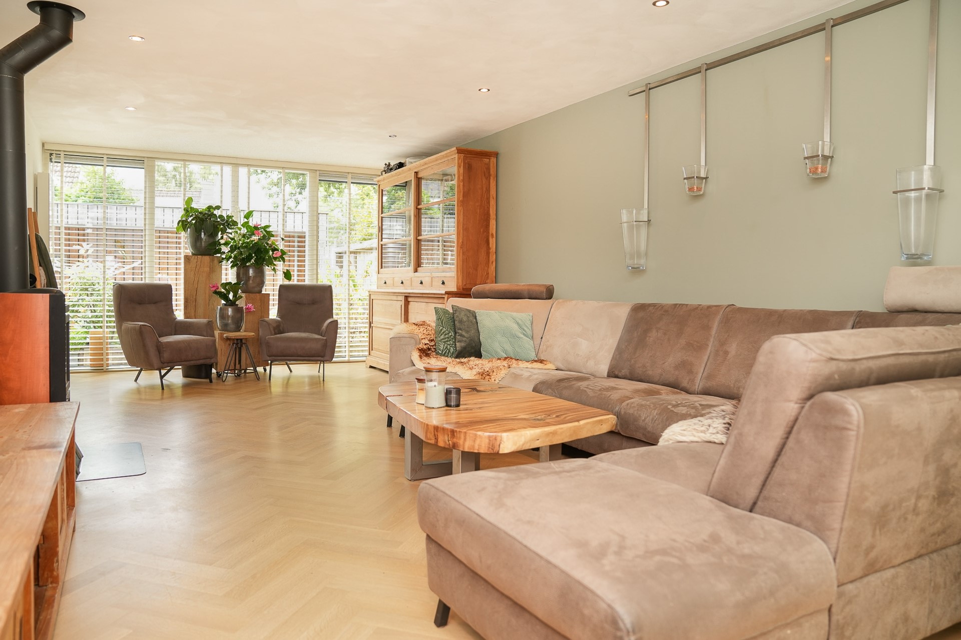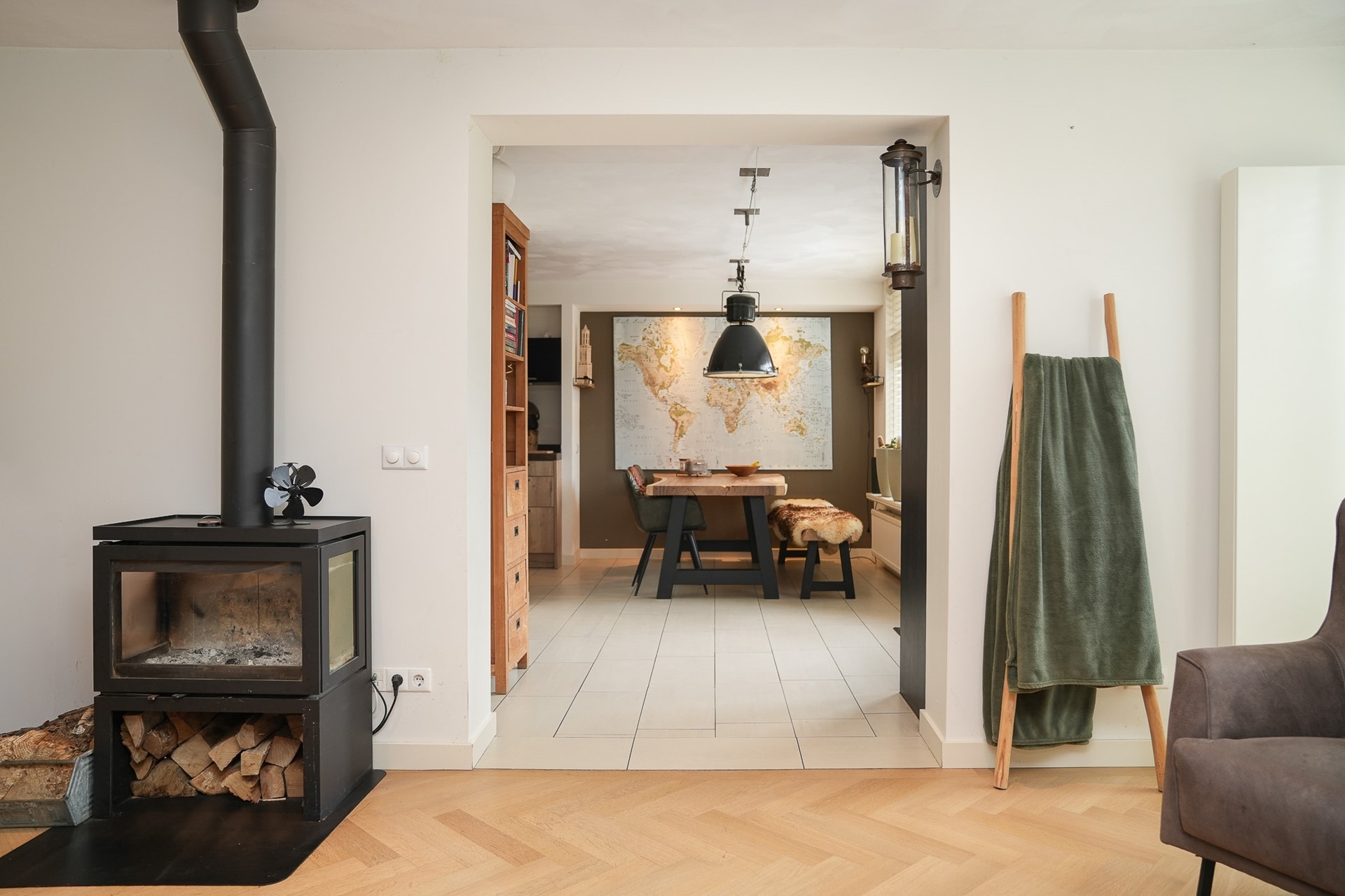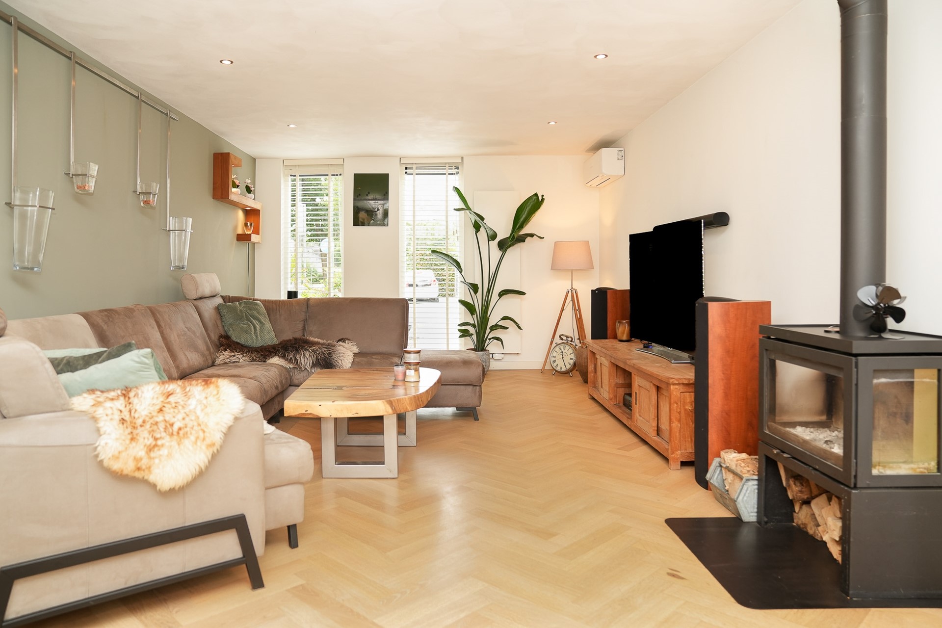 Dankzij de royale uitbouw aan de zijkant is er een fantastische, lichte woonkamer ontstaan. Grote raampartijen, een warme visgraat parketvloer, een gezellige houtkachel en moderne inbouwspots zorgen voor een fijne sfeer. Ook hier is een airconditioning (2021) aanwezig, die naast koelen ook kan verwarmen.