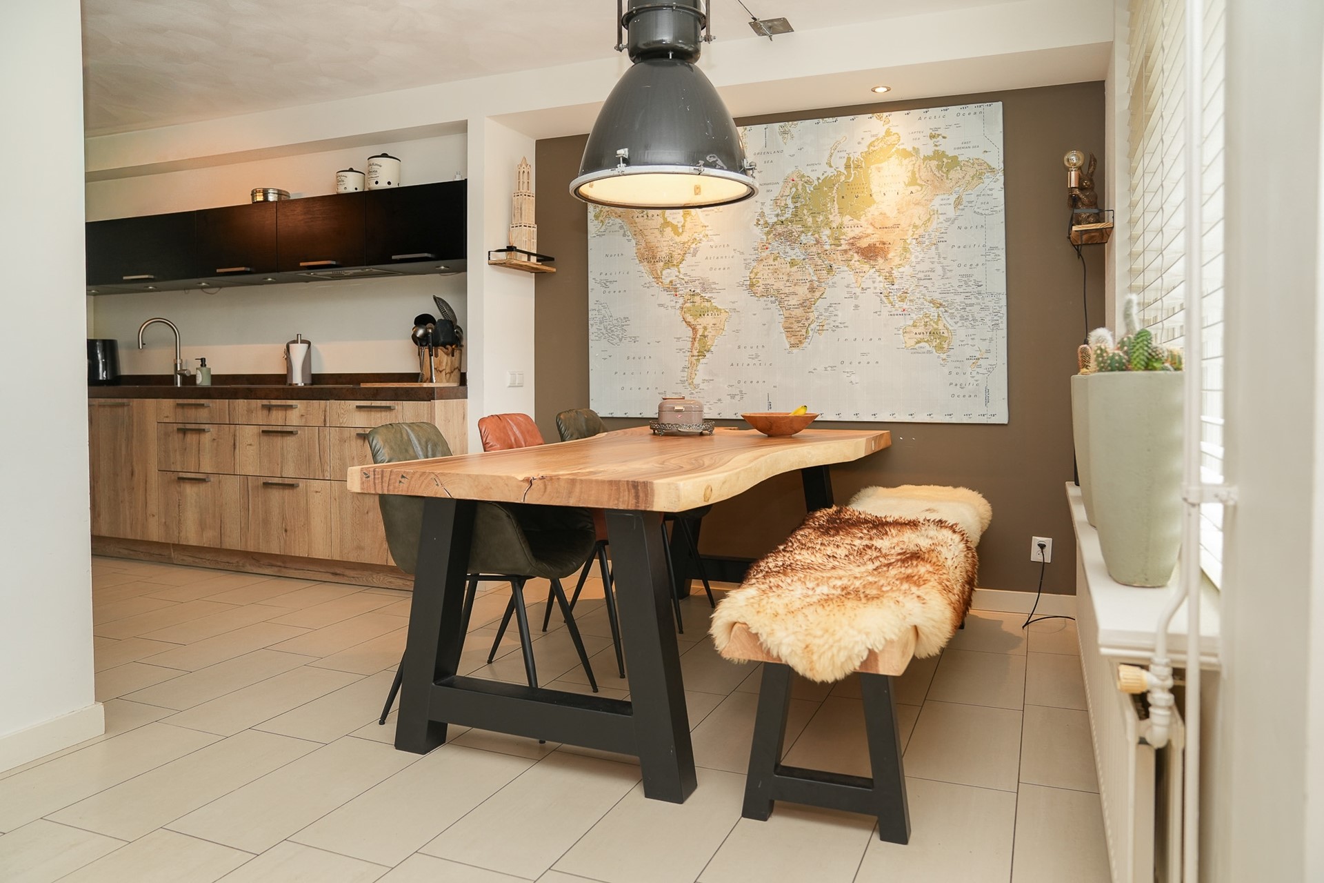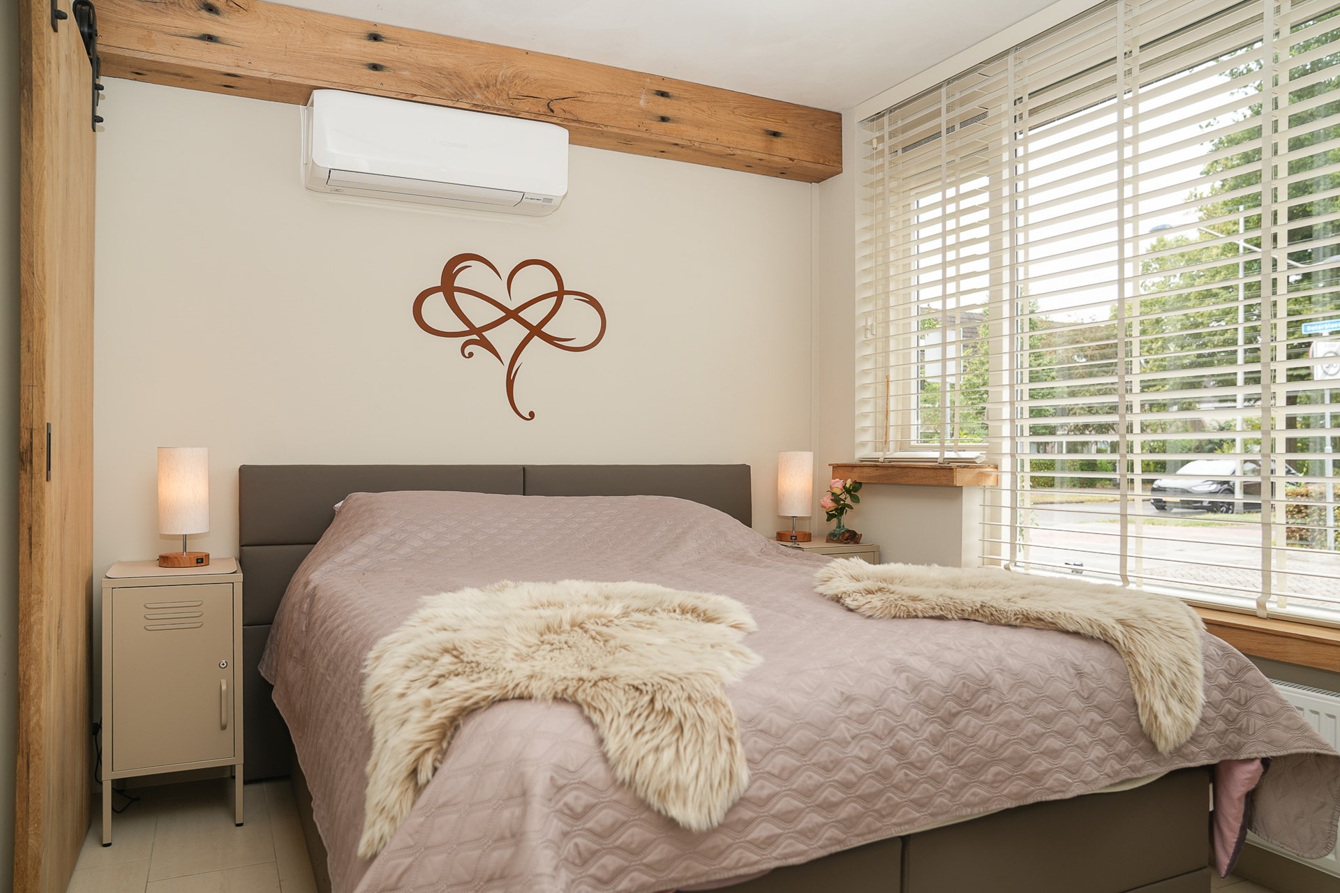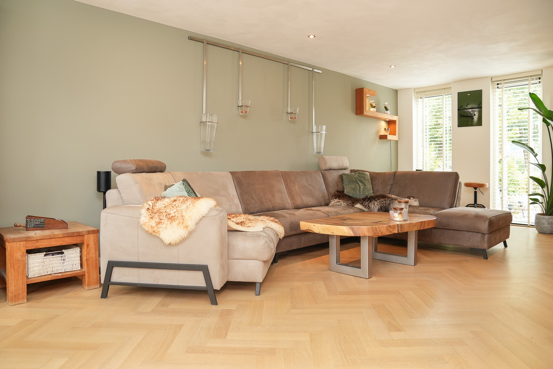 Dankzij de royale uitbouw aan de zijkant is er een fantastische, lichte woonkamer ontstaan. Grote raampartijen, een warme visgraat parketvloer, een gezellige houtkachel en moderne inbouwspots zorgen voor een fijne sfeer. Ook hier is een airconditioning (2021) aanwezig, die naast koelen ook kan verwarmen.
