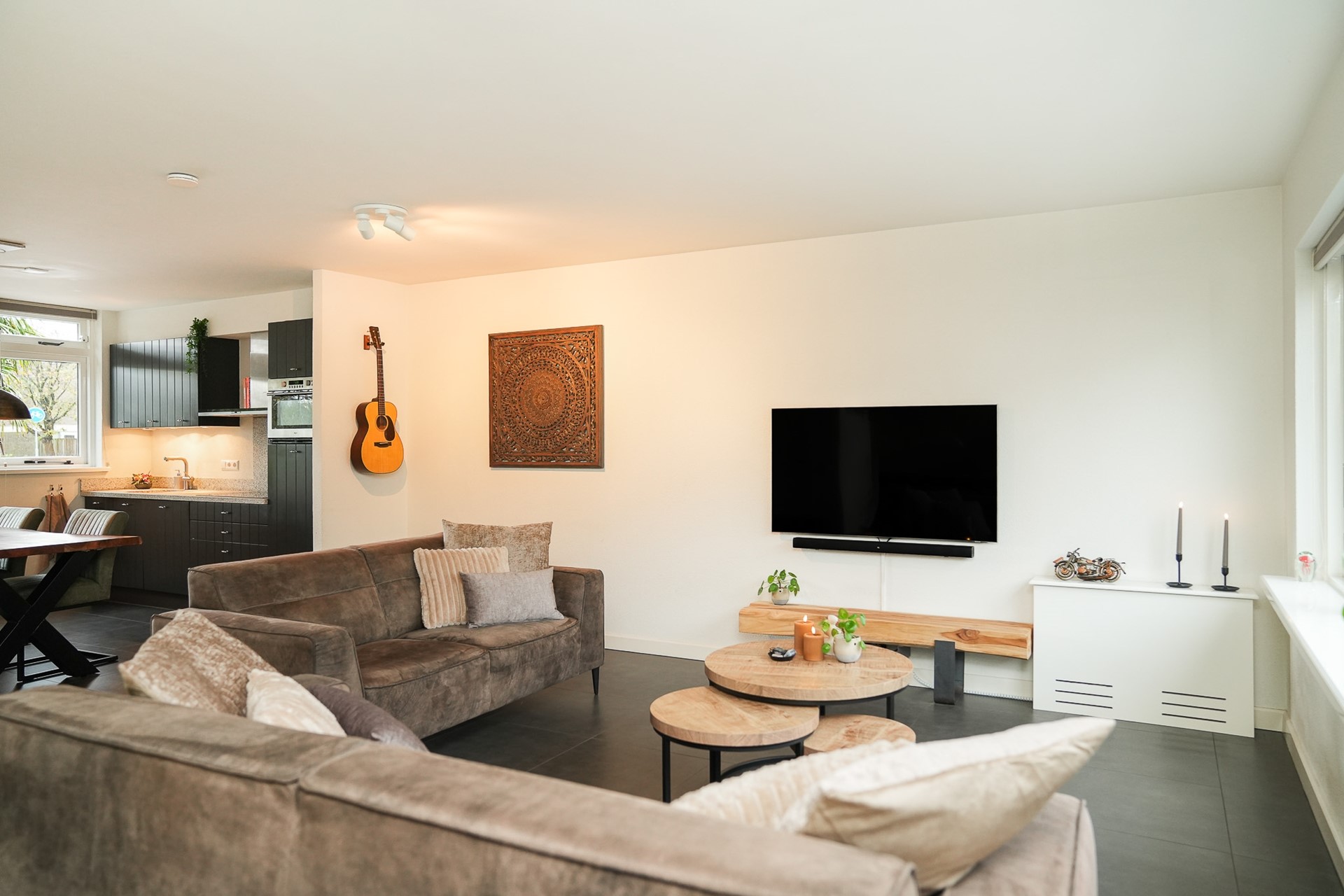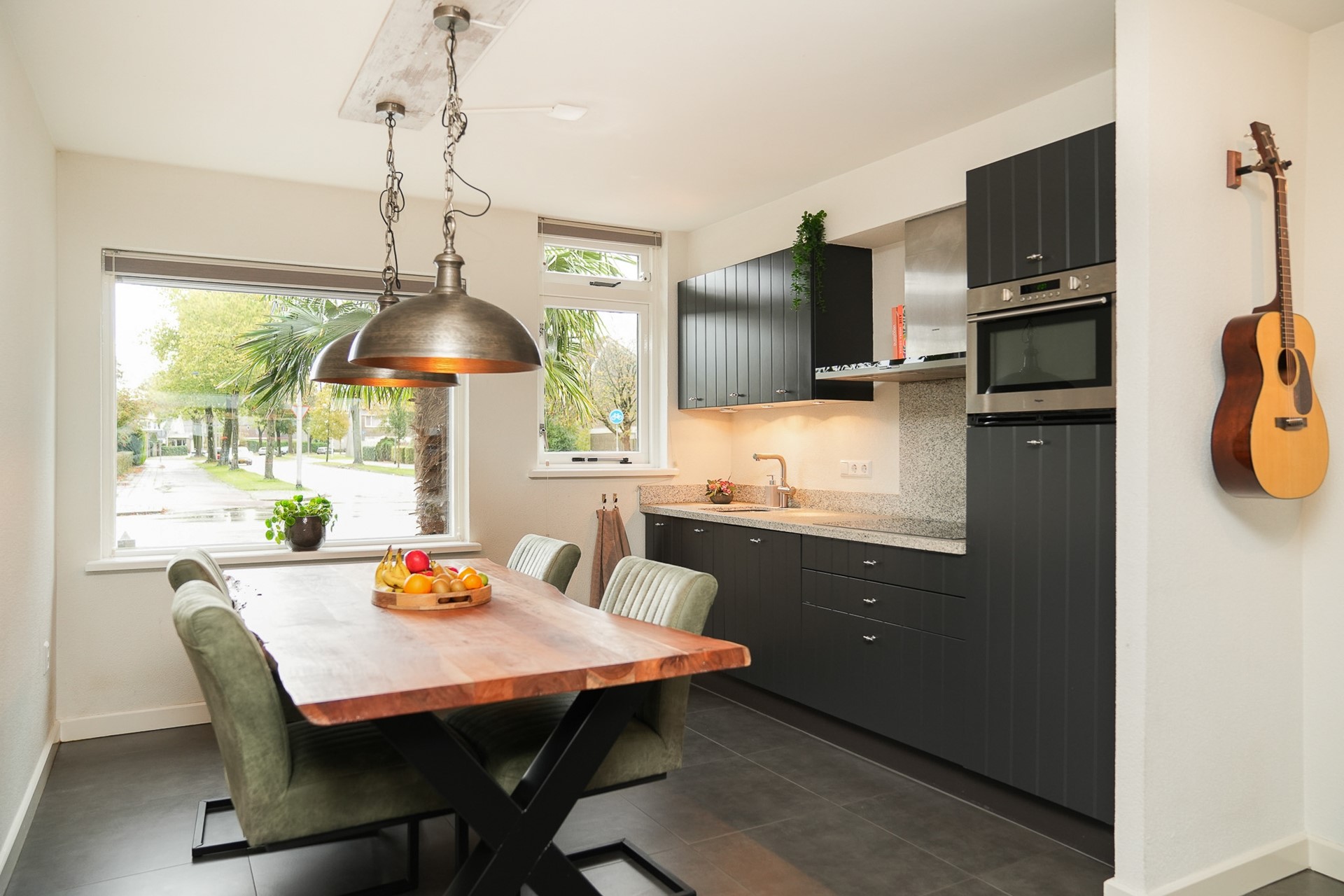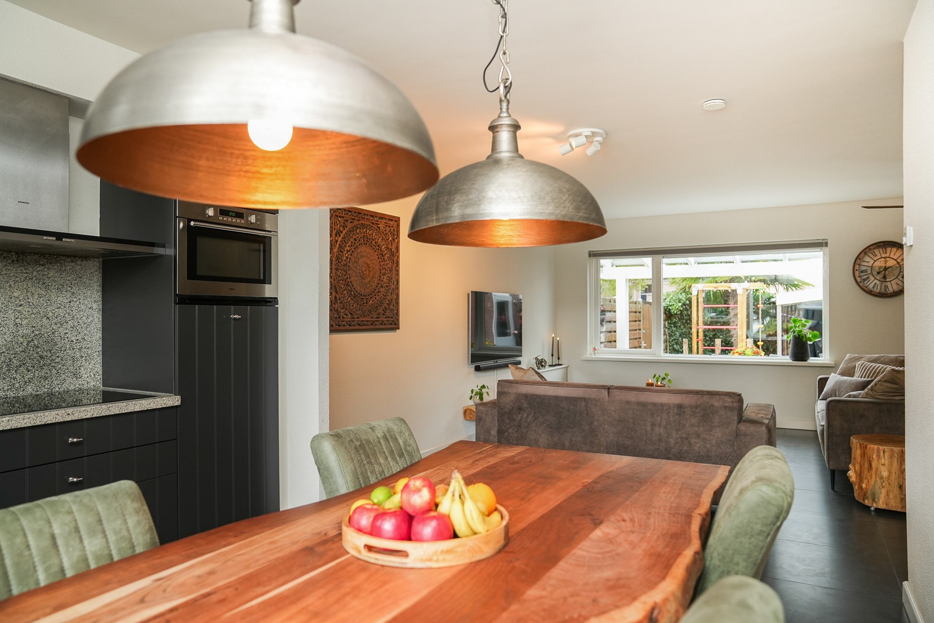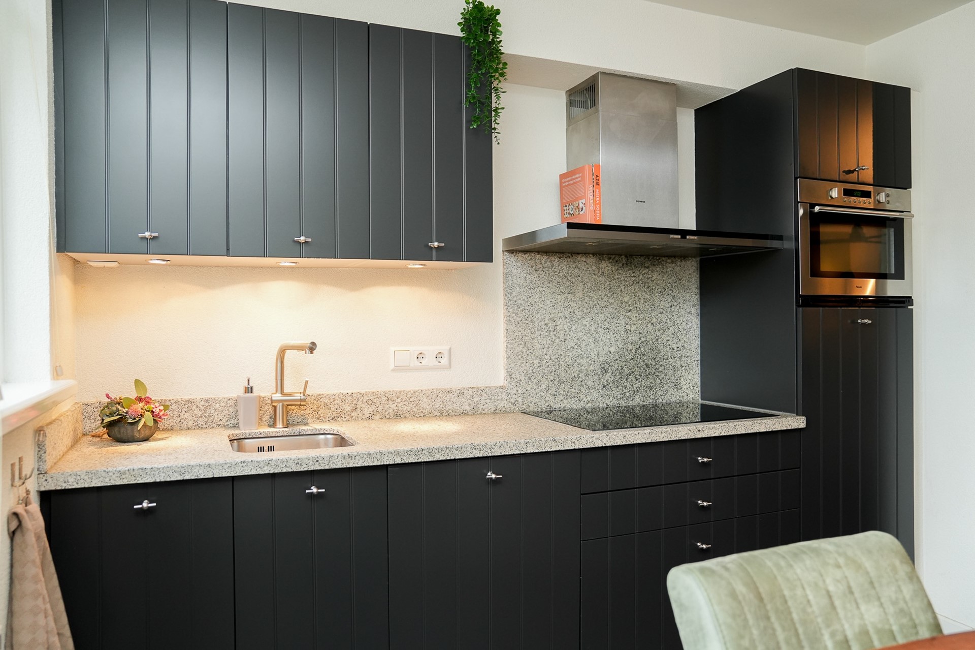 Aan de voorzijde van de woning bevindt zich de moderne keuken met natuurstenen werkblad, spoelbak en volop kastruimte. De keuken is uitgerust met diverse inbouwapparatuur waaronder een Siemens vaatwasser (2021), inductiekookplaat, afzuigkap, combimagnetron en koelkast. Dankzij het grote raam aan de voorzijde met HR++ glas geniet je hier van veel natuurlijk licht en het vrije uitzicht.