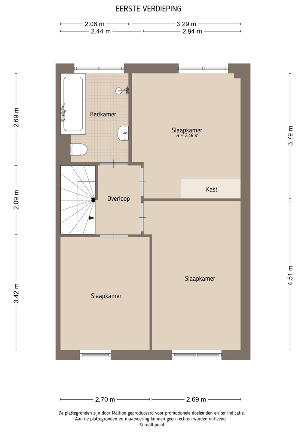 Op de eerste verdieping vind je drie goed bemeten slaapkamers, allen voorzien van laminaatvloeren en houten kozijnen met HR++ glas. De badkamer is ingericht met een o.a. een ligbad, douchecabine, zwevend toilet, wastafelmeubel en is voorzien van mechanische ventilatie en handdoekradiator.
