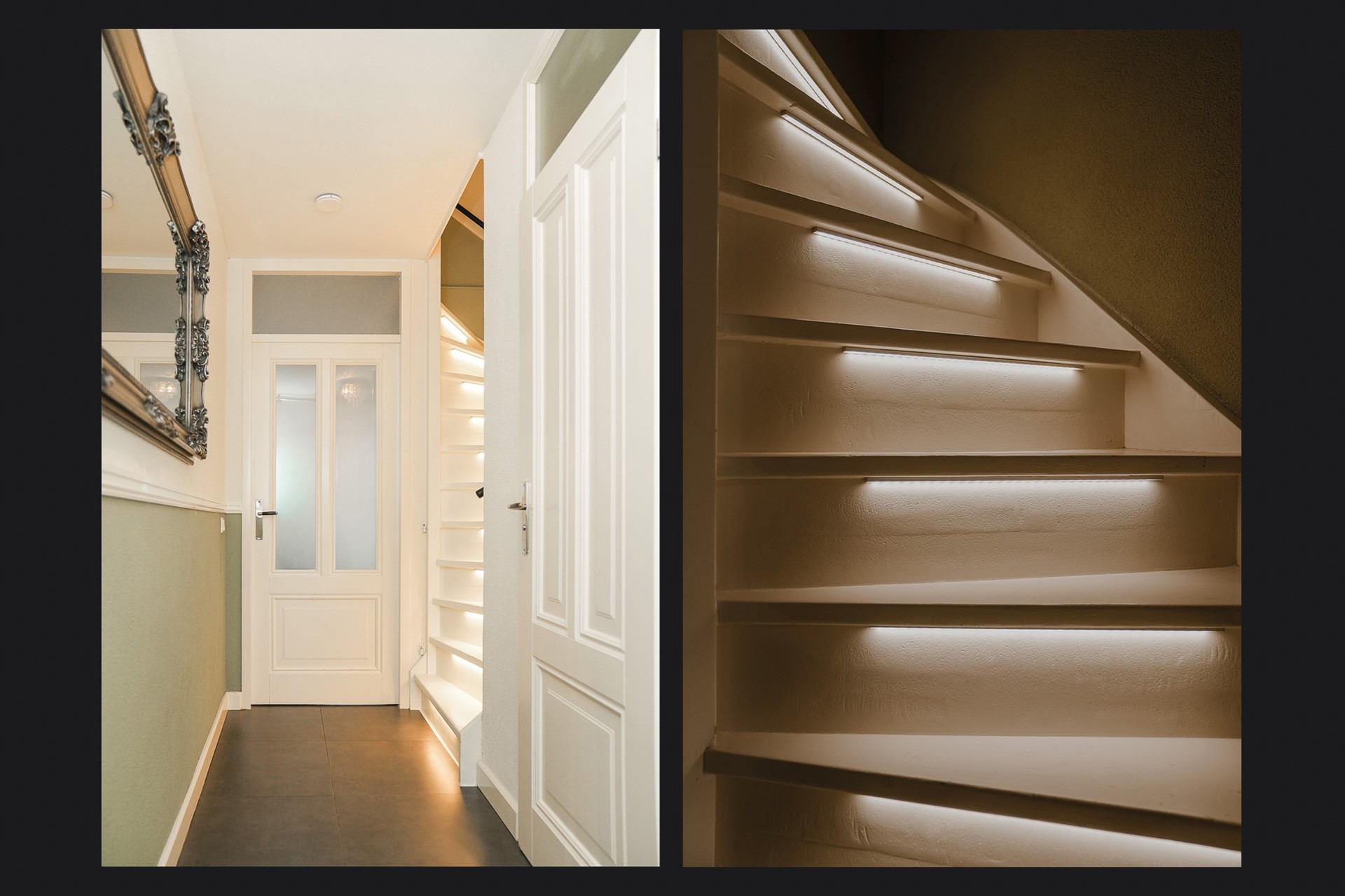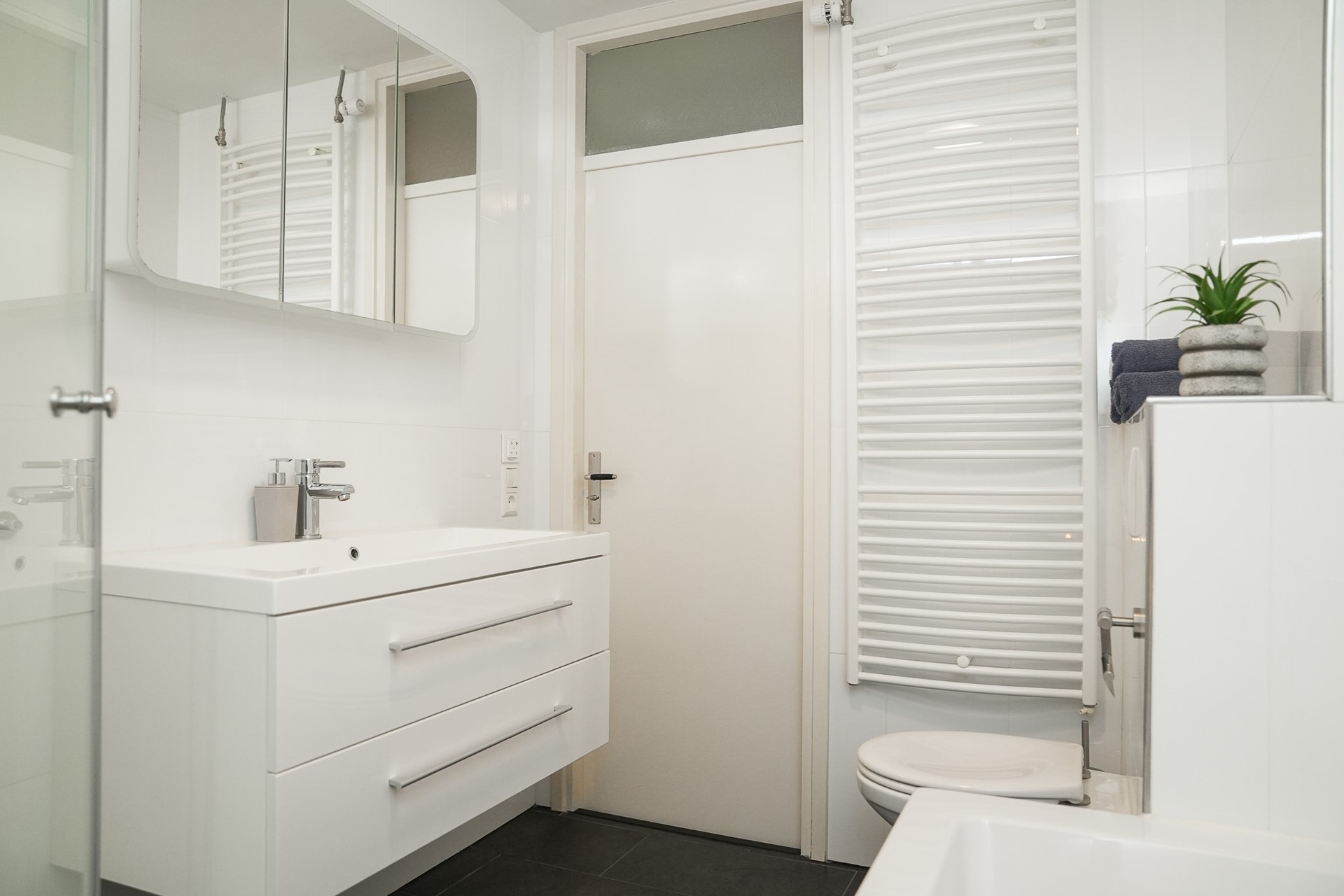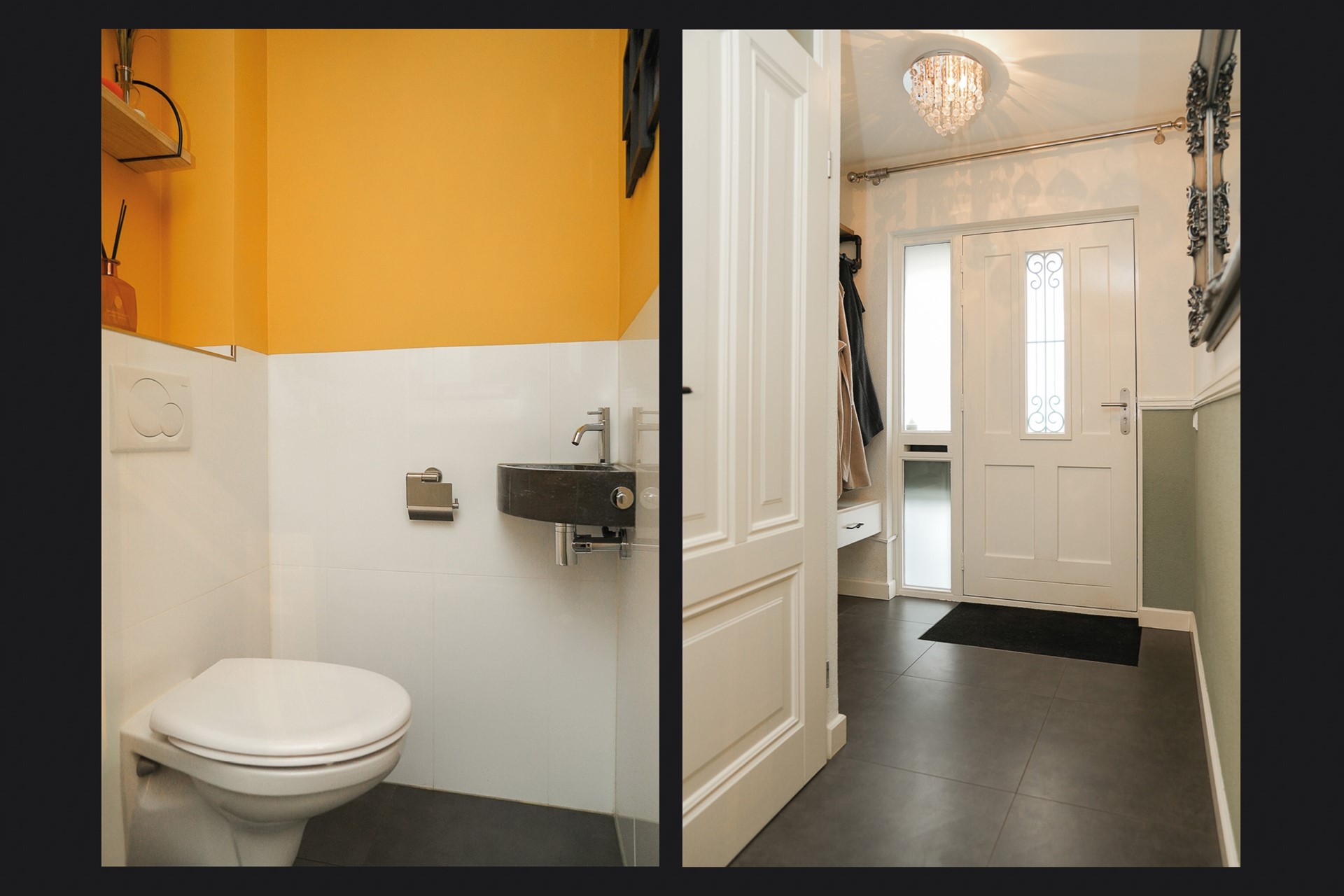 Binnenkomst via de nette entree met garderobe, meterkast en toilet. De begane grond is voorzien van een stijlvolle antracietkleurige plavuizen vloer met vloerverwarming, welke zorgt voor comfort en een luxe uitstraling.