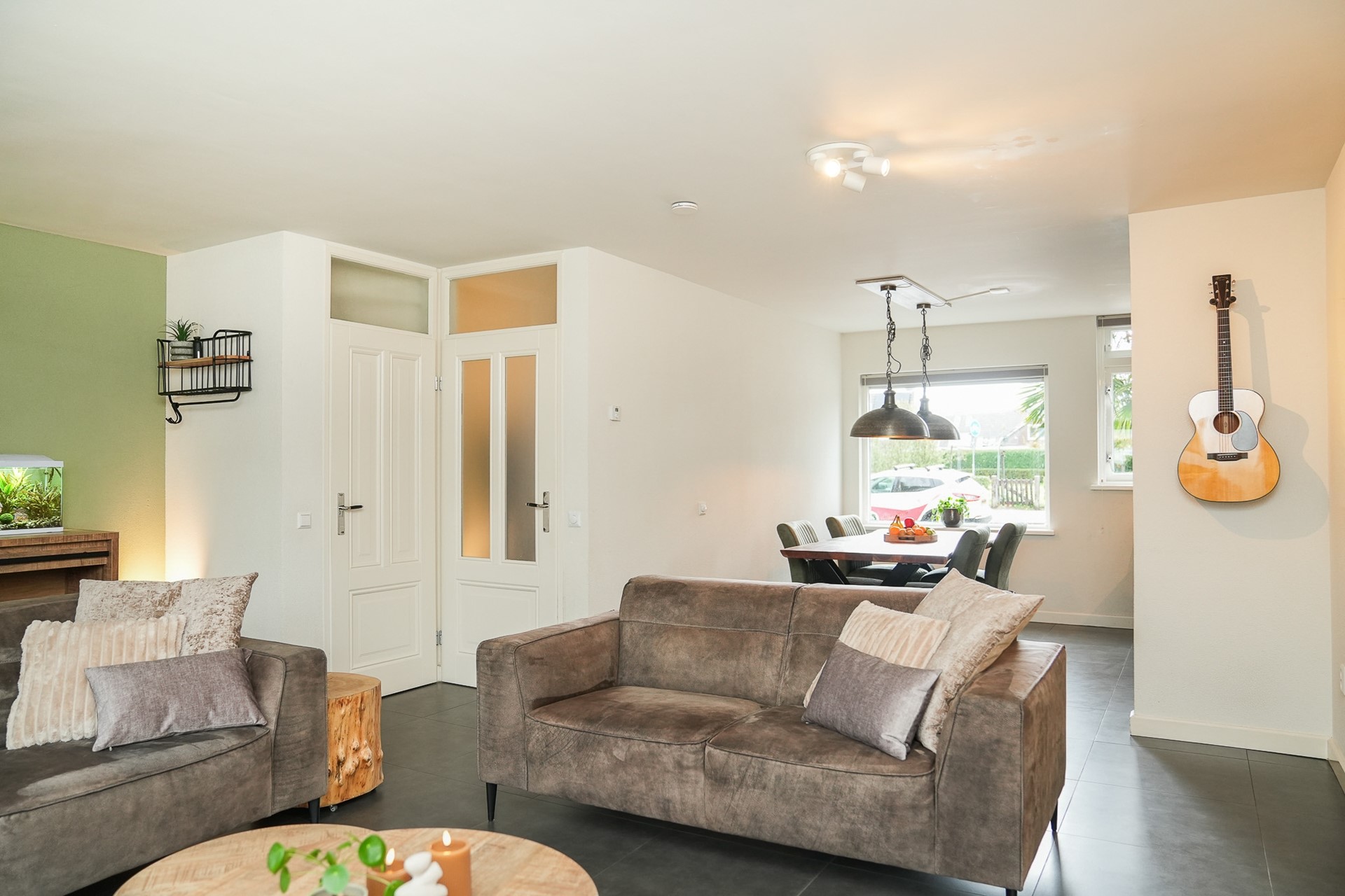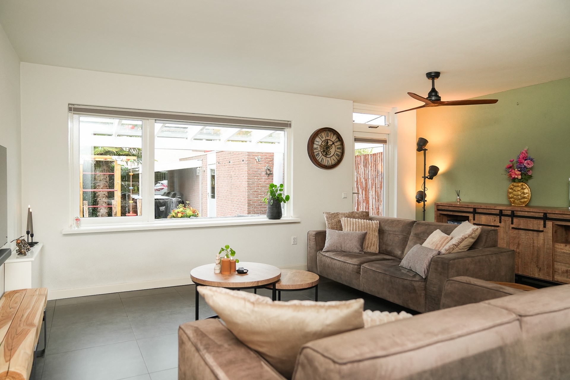 De ruime woonkamer heeft een fijne lichtinval door de grote raampartijen aan de voor- en achterzijde. Vanuit de woonkamer stap je direct de moderne overkapping met zonwering in – een heerlijke plek om het hele jaar door van de tuin te genieten. De tuin is verzorgd aangelegd met extra overkapping achterin de tuin, borders, terras, ruime berging met stroom en ligt gunstig op het zuidwesten.