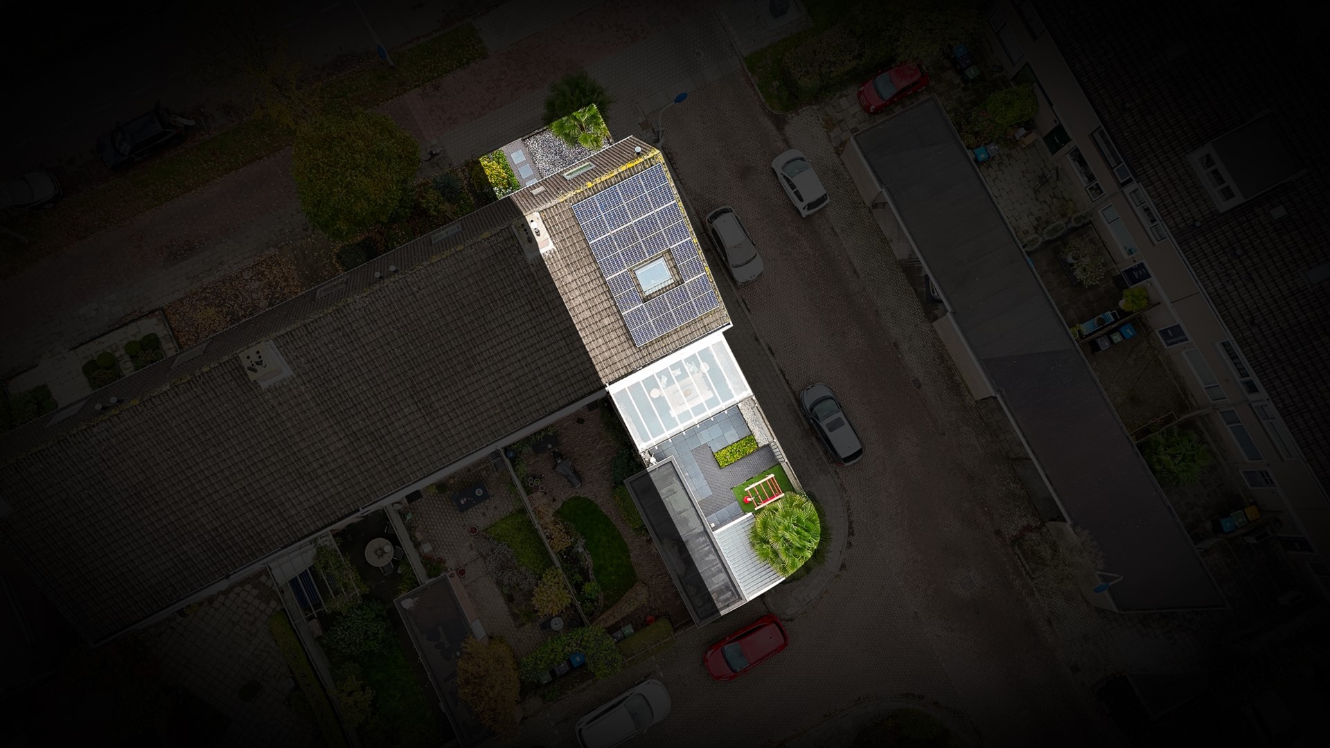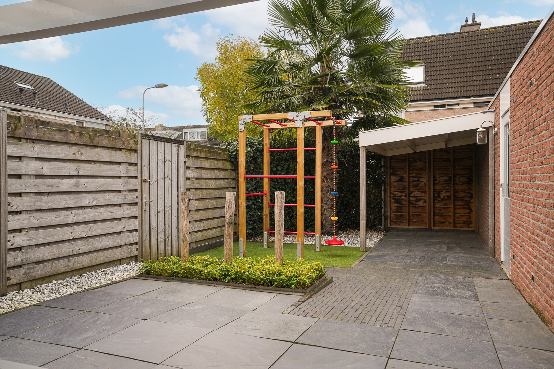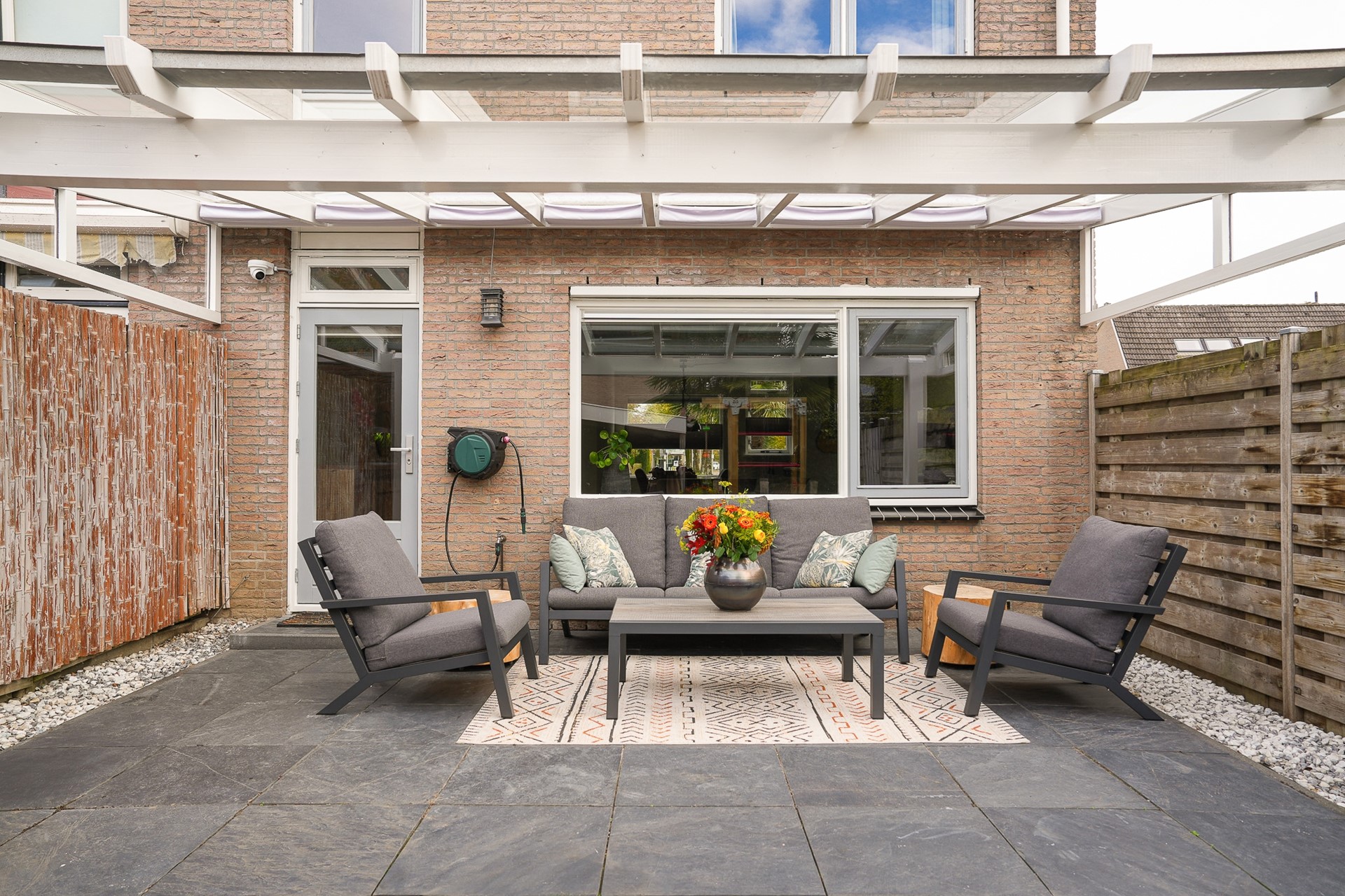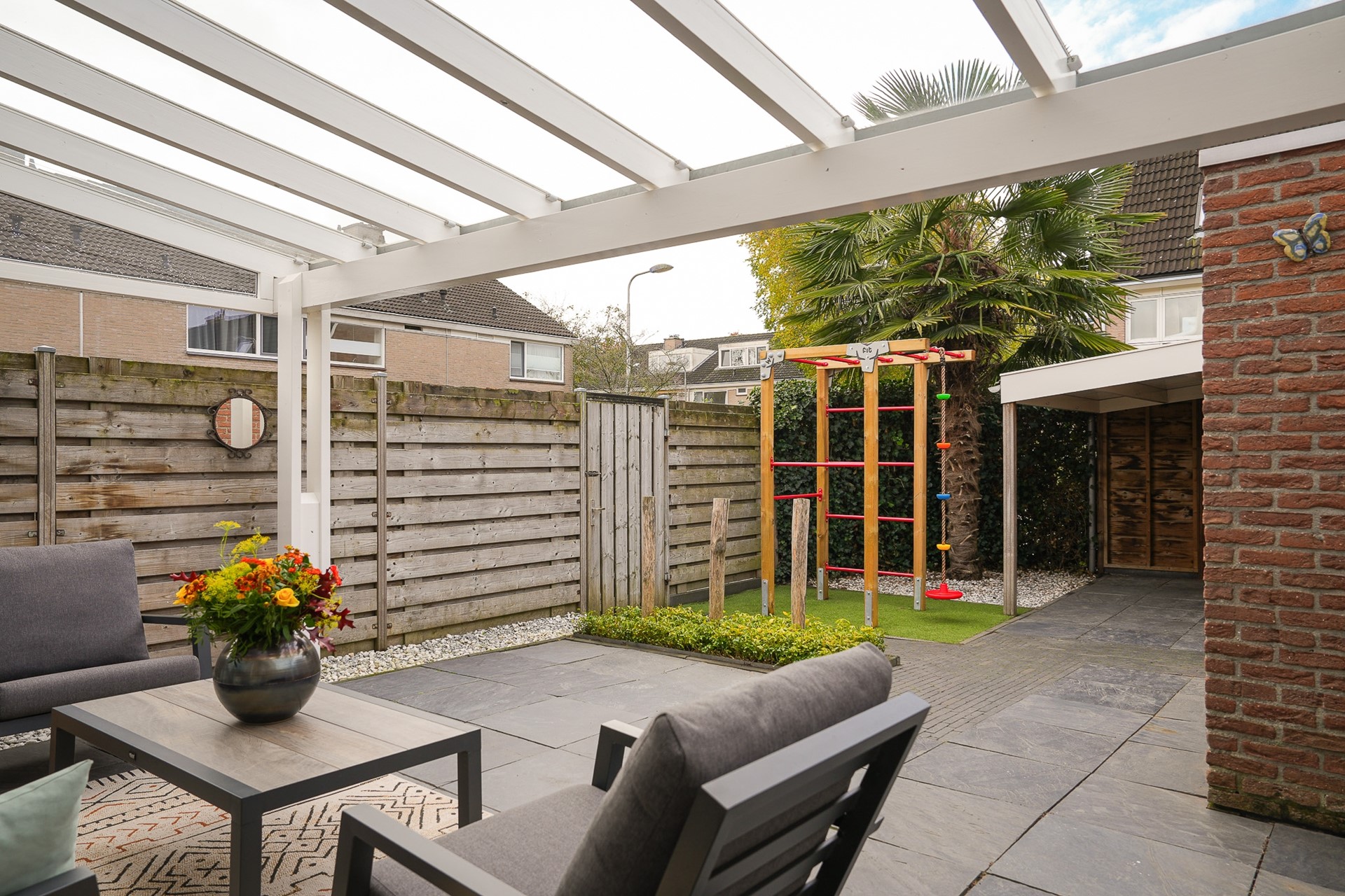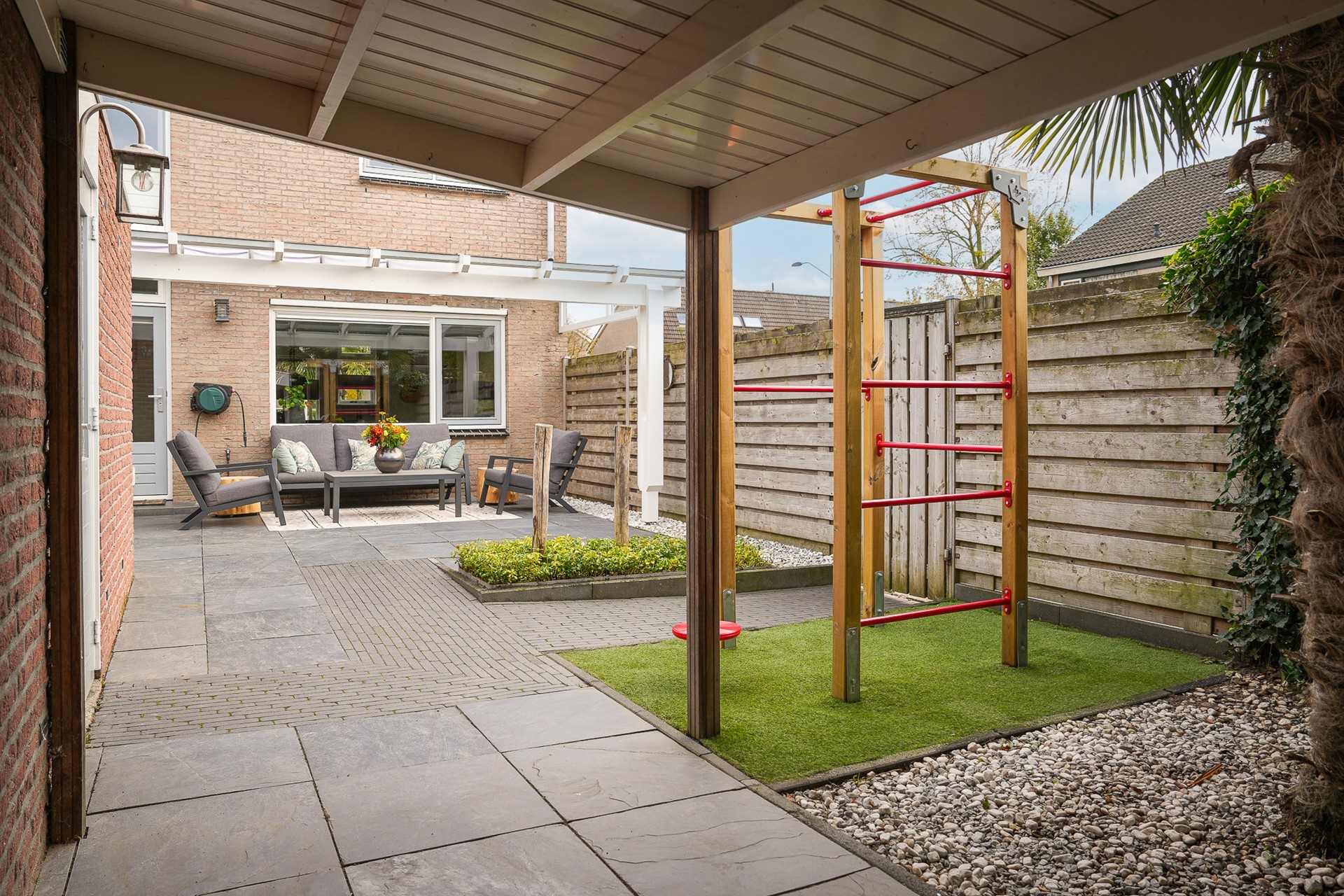 • Overkapping achtergevel met zonwering en extra overkapping achter in de tuin
