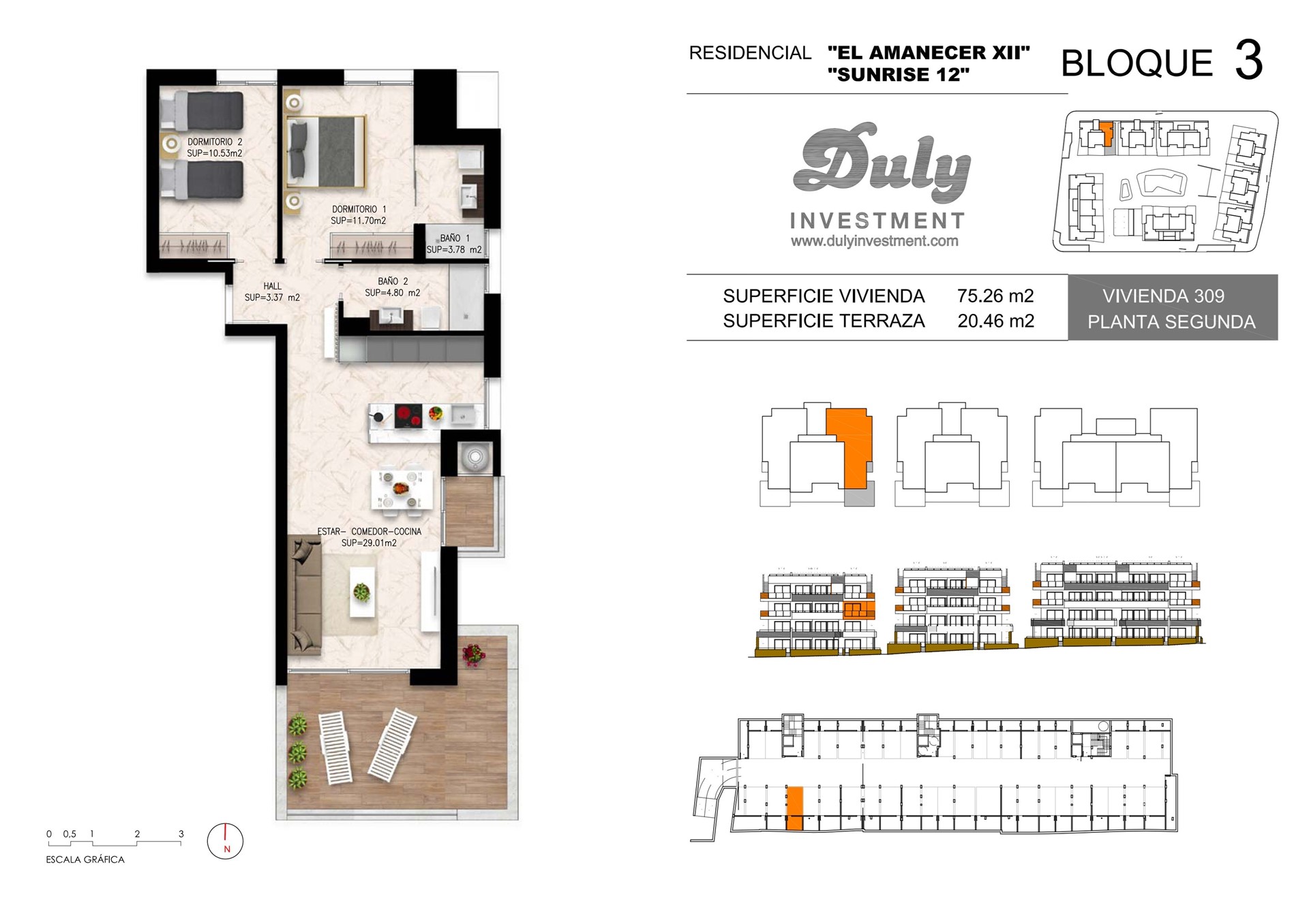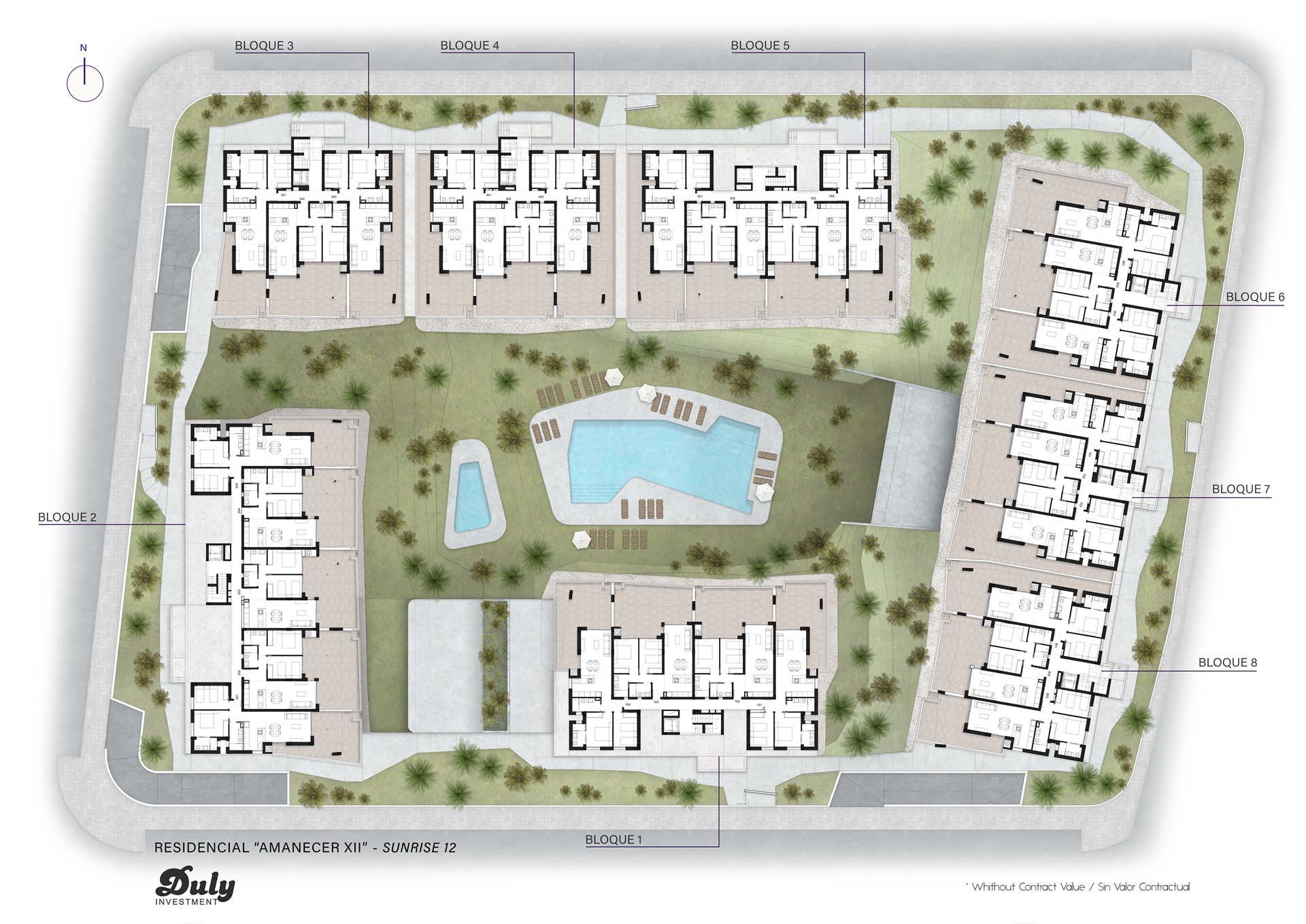 Residential Amanecer XII - Sunrise 12 – Properties completely furnished with underground parking space, private closed storage and with communal pool, gym, etc. The residential Sunrise 12 is composed of 112 apartments with spacious terraces with 2 bedrooms and 2 bathrooms. 8 blocks divided into ground floor, first floor, second floor and penthouses with terrace and private solarium terrace on top.